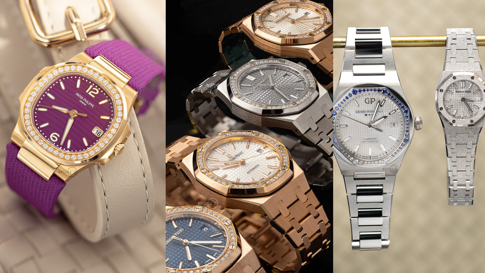 Patek Philippe introduces an original alliance between stainless steel and baguette-cut diamonds in a new version of the Nautilus 5711 model. The distinctive shape of the octagonal bezel with its softened angles is accentuated by a row of 32 internally flawless Top Wesselton baguette-cut diamonds (~3.6 cts). The fire of the diamonds highlights the new olive-green dial enhanced by an embossed horizontal motif and sunburst decoration. This elegant sports model houses a self-winding caliber visible through a transparent sapphire case-back.