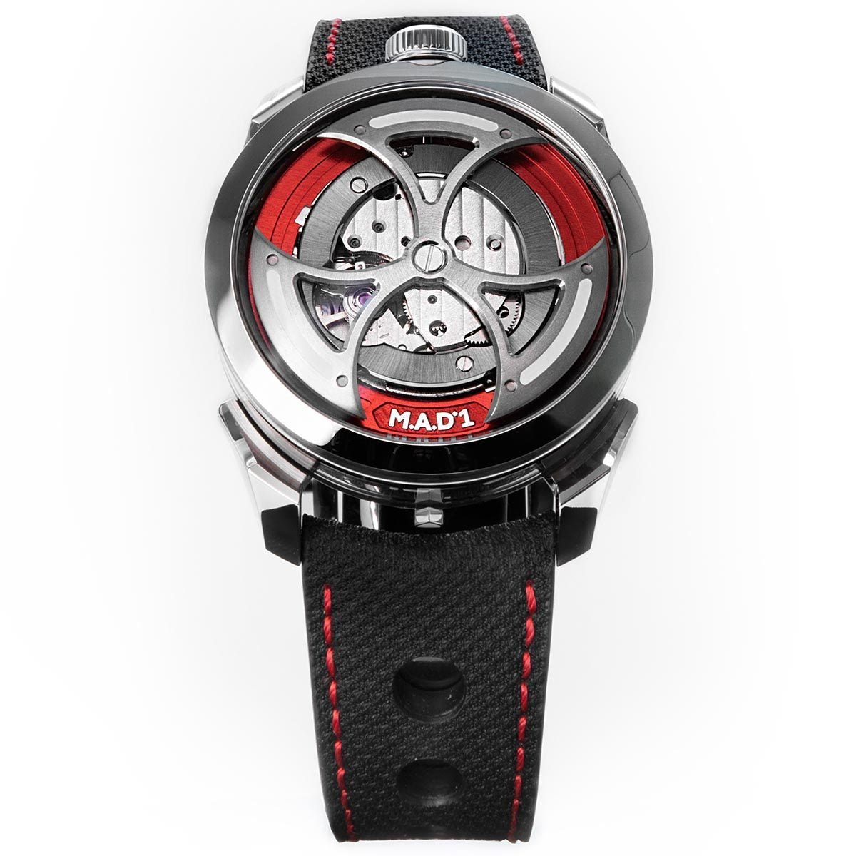 Starting off strong, we have the MB&F M.A.D.1, reference number 4099040. The cool thing about this watch is that you don't even have to turn it towards yourself to tell the time; you can tell the time by looking at the side of the case, and a little white arrow tells you exactly what time it is. It's called an exotic dial, and it's entertaining to spin it, and you can watch it spin for hours. We love what they've done with this collaboration, and now people can say that they own an MB&F at a fraction of the price of a mainline MB&F.