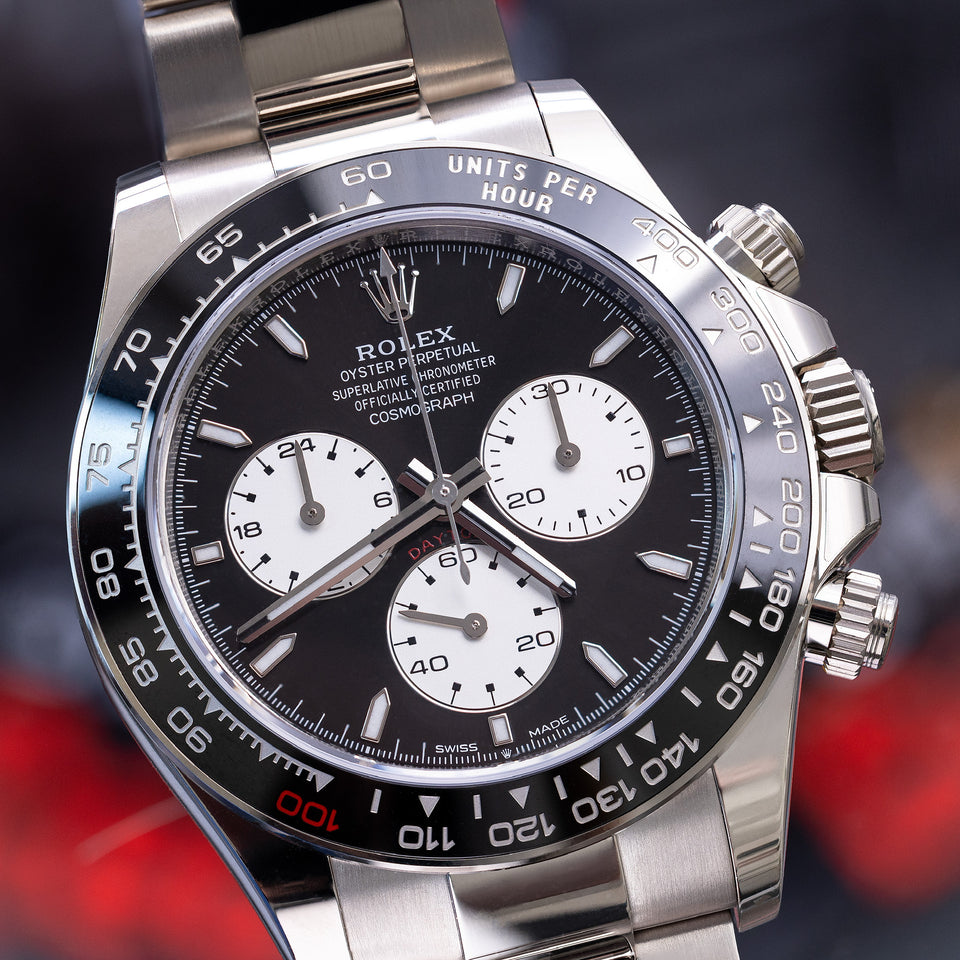 40mm stainless steel case, sapphire crystal back, embossed black dial, self winding caliber 324 S C movement with date, approximately 45 hour of power reserve, stainless steel bracelet. Water resistant to 120 meters.