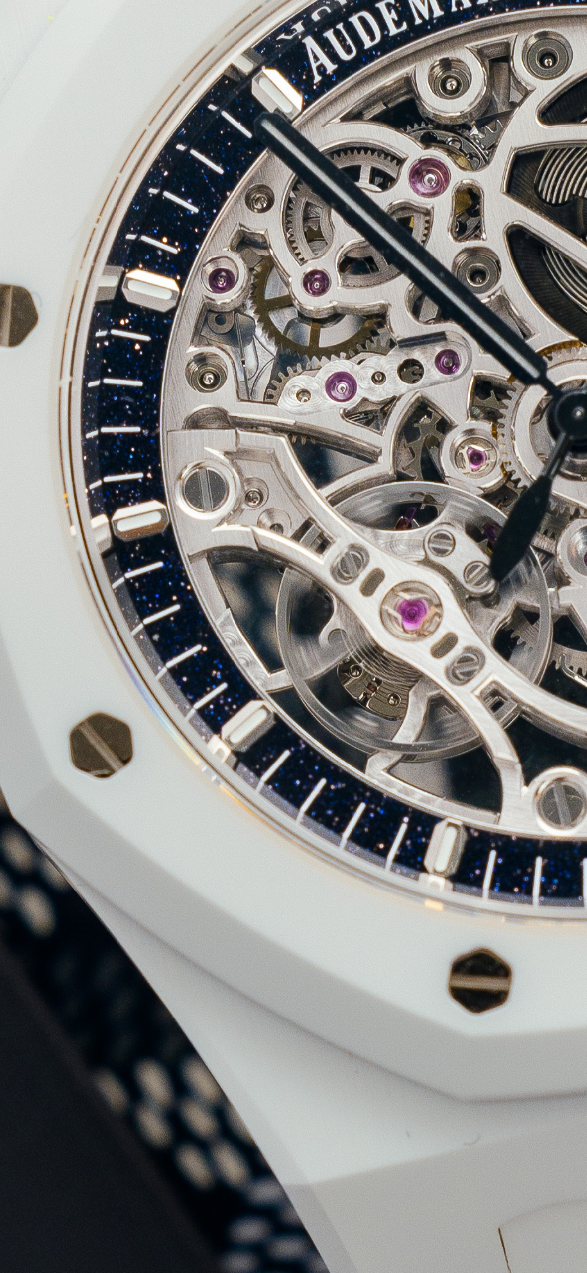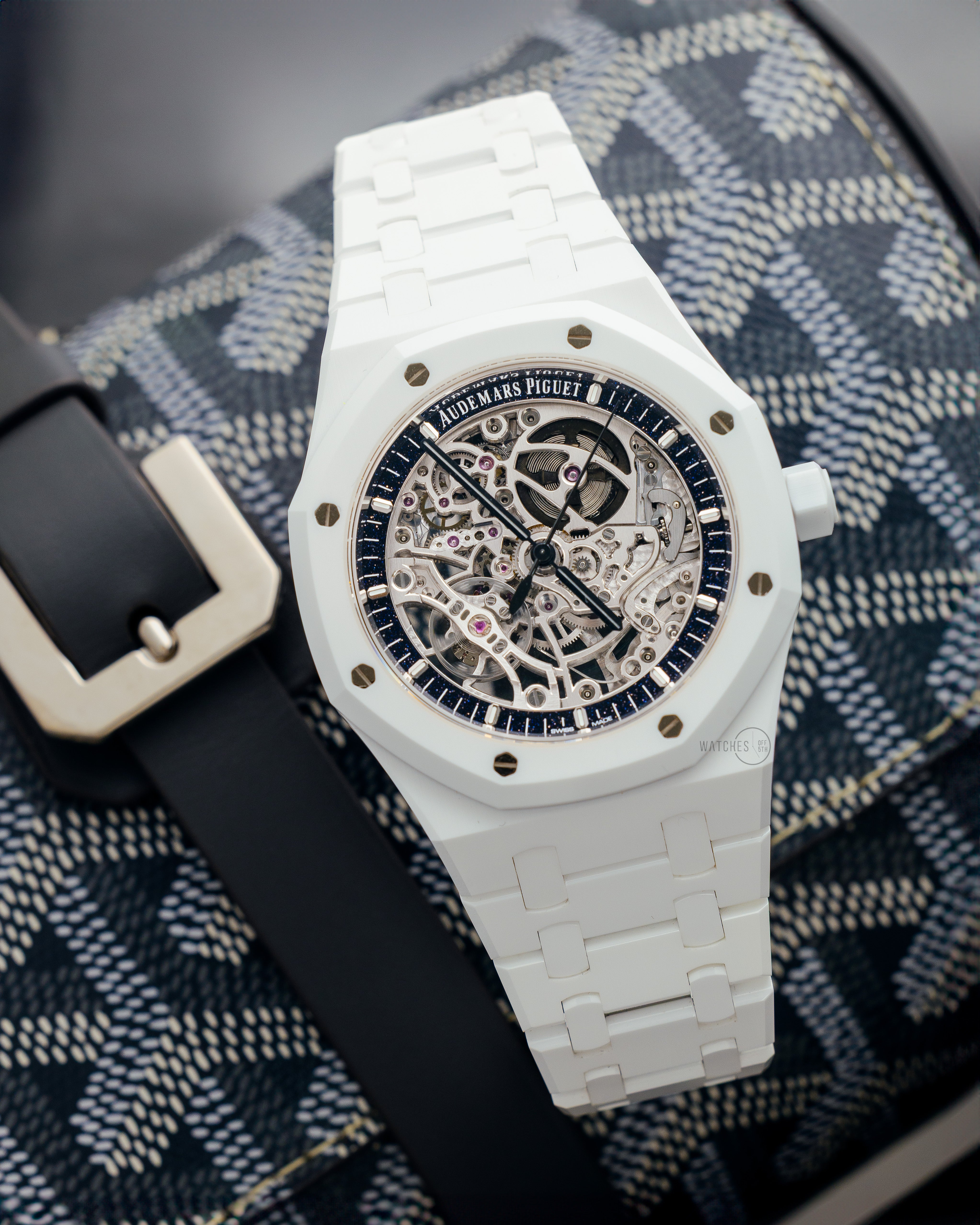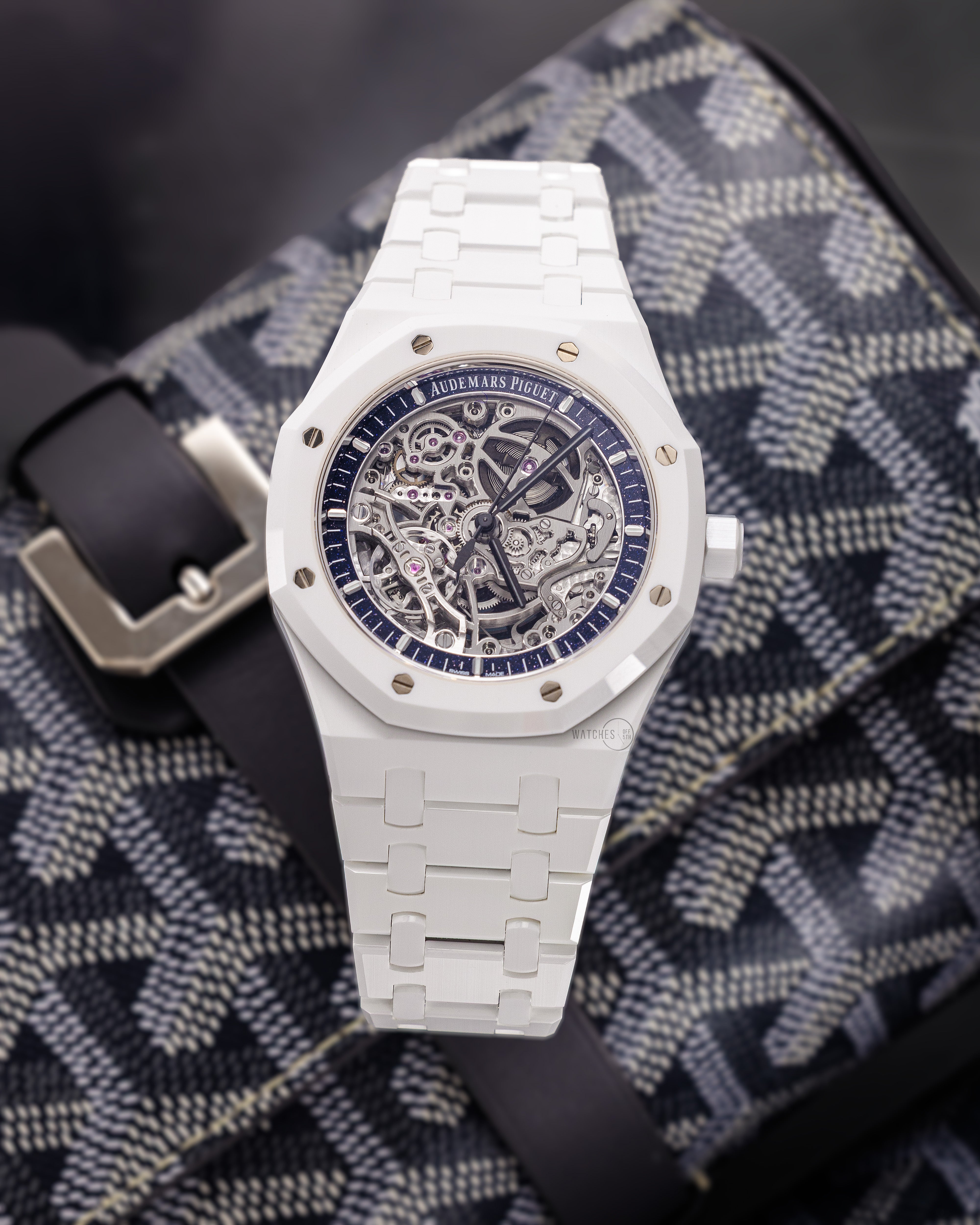 White ceramic begins as fine powder and then is fired at extreme heat to make it strong and scratch-resistant. On this Royal Oak, it feels crisp and quiet, wrapping around a dial full of movement and detail. It is modern, rare, and built with strength that defies its softness.