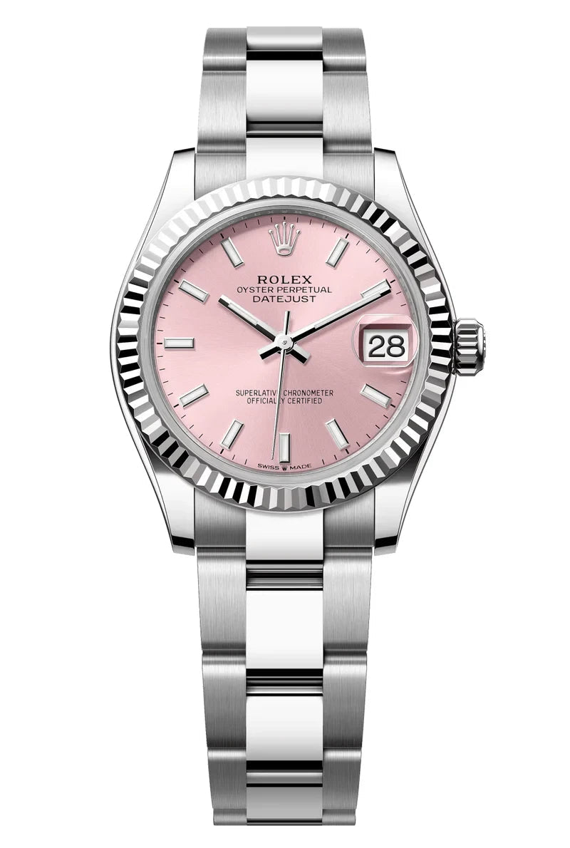 31mm Oystersteel and 18K white gold case, monobloc middle case with screw-down case back and winding crown, screw-down crown with Twinlock double waterproofness system, 18K white gold fluted bezel, scratch-resistant sapphire crystal with Cyclops lens over the date, pink dial with sunray finish and index hour markers, highly legible Chromalight display with long-lasting blue luminescence, Rolex calibre 2236 perpetual self-winding movement with centre hour, minute and seconds hands, instantaneous date with rapid setting, stop-seconds for precise time setting, Syloxi hairspring in silicon with patented geometry and high-performance Paraflex shock absorbers, approximately 55 hours of power reserve, Oystersteel Oyster bracelet with three-piece solid links, folding Oysterclasp with Easylink 5mm comfort extension link. Waterproof to 100 metres / 330 feet. Superlative Chronometer certified.
